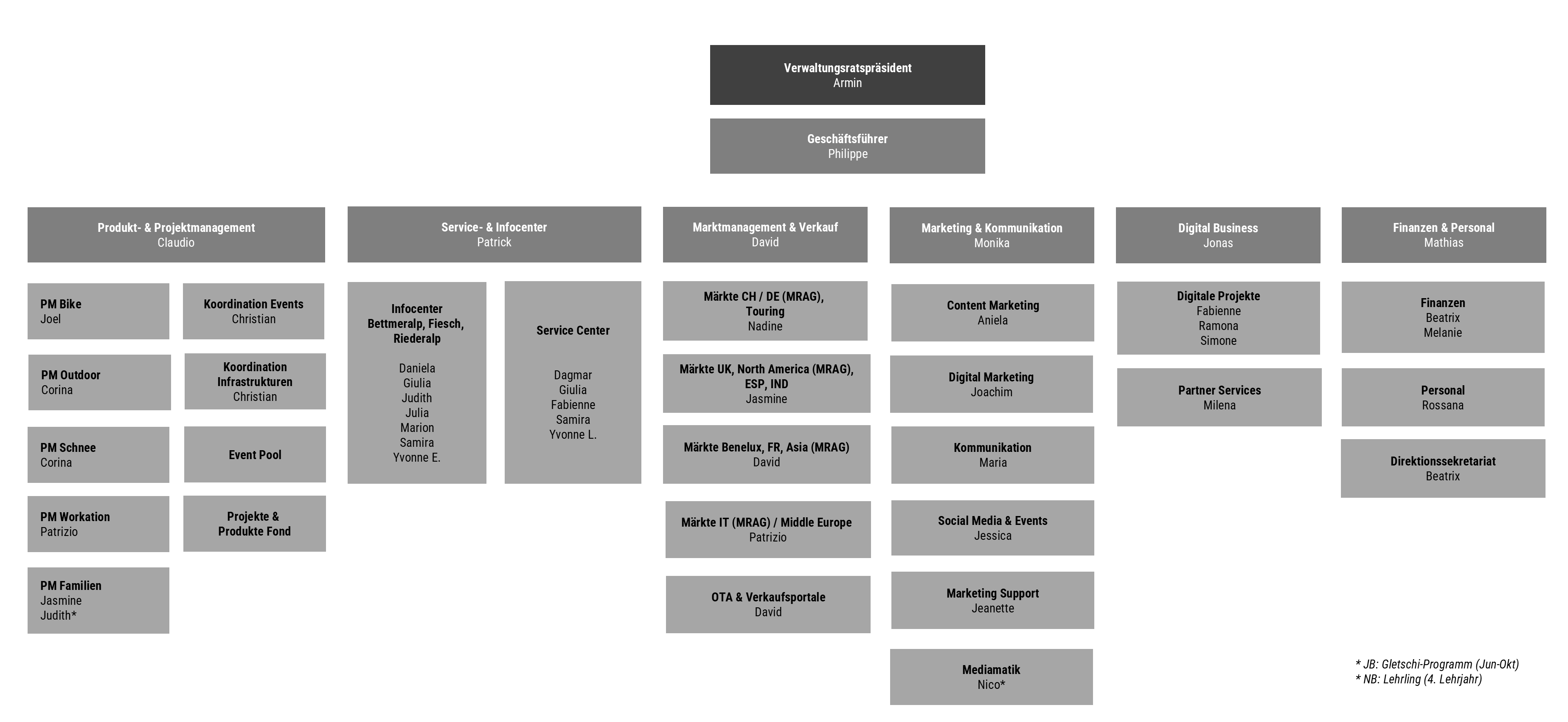 Hier erhältst du einen Einblick in unsere Abteilungen, Organisation und Strukturen, die Unternehmensstrategie und den Verwaltungsrat. Transparent, persönlich und engagiert für unsere Destination!